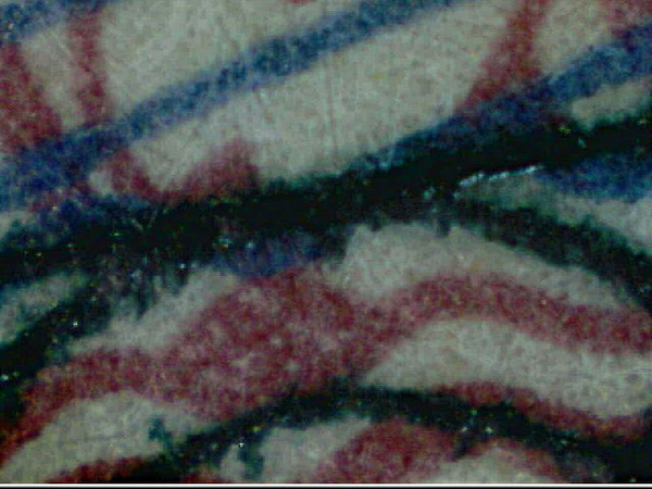 右の画像は、千円札の表面を顕微鏡で撮影した写真です。 碧(あお)や朱(あか)そして黒い線を、拡大撮影した写真です。 この写真は可視光で撮影しているので、私たちがふだん眺めている千円札の色ということになります。