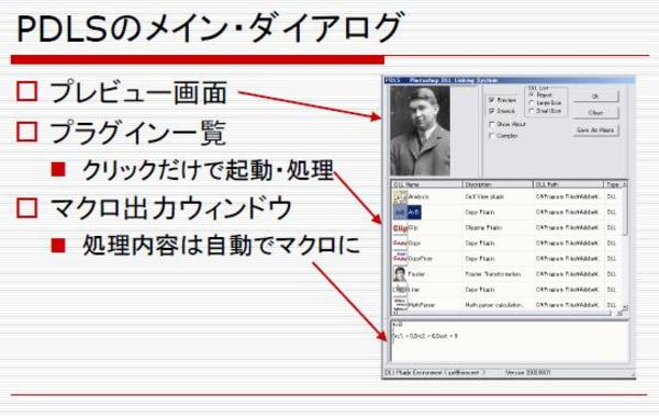 AmetMultiのモットーは「ATOKから何でもできる」でしたが、PDLSのモットーは「Photoshopから(その人のレベルに応じて)何でもできる」でした。(Photoshopの規約は気にせず)Cを使ってネイティブ・プラグインを気軽に書くこともできれば、GUIを使った連続作業などで自動的にマクロ関数(プラグイン)をお手軽に作ることもできる。その人のレベルに応じて、ステップアップすることができるPhotoshopのプラグイン開発環境というわけです。