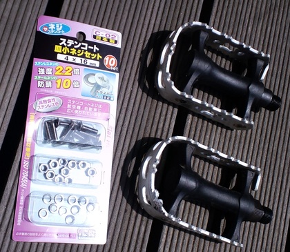 POWER GRIPSはそんな優れものなのですが、モノとしては単なる穴の開いたベルトとネジです。そして、その見た目の質素さにくらべて)少々値が張るので、自作"POWER GRIPS"モドキを作る人たちがいます(参考資料1・参考資料2・参考資料3・参考資料4(最新版のPOWER GRIPSと同じように作るなら、リンク先で使っている金具は不要です))。必要な材料は、(普通の)ペダルに適当なベルト素材とネジだけですから、身の回りを探せば、買わずとも両方とも手に入りそうに思われます。あるいは、両方買ったとしても、100円ショップなら消費税込210円ナリで材料を揃えることができます。