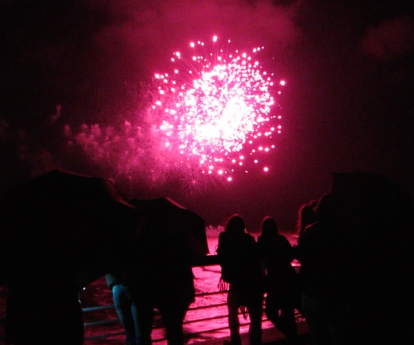方向的には、この花火の先、海の向こう150kmくらい先に、イギリスがあるはずだ。…といっても、地球は丸いから、いくら障害物が無かったとしても4kmくらい先までしか見通すことはできない。