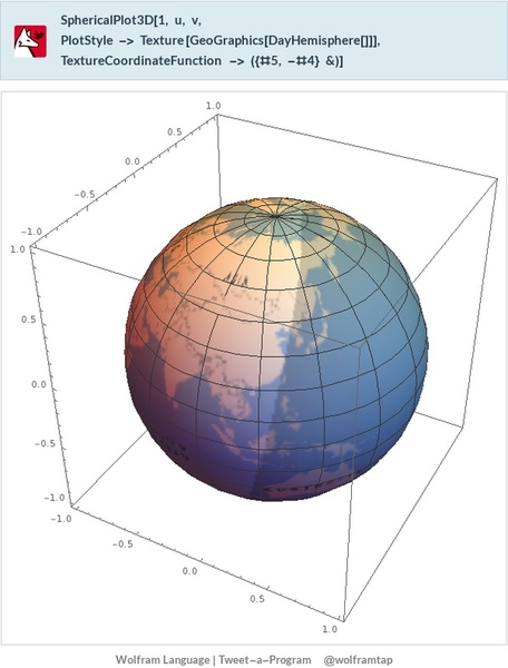 @wolframtap SphericalPlot3D[ 1, u, v, PlotStyle -> Texture[ GeoGraphics[ NightHemisphere[]]], TextureCoordinateFunction -> ({#5, -#4} &)]
