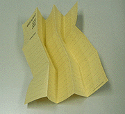 さて、この三浦折りの「できるかな?」特製「落書き紙」は折り畳めばとても薄く小さいから、ポケットに入れていつも持ち歩いて、心に浮かんだことなどを書きとめて持ち歩くのに最適だと思う。そして、この落書き紙の裏や表に、思ったことの表から裏までを書き留める。そして、そんな思い・考えの切り抜き・断片、を小さく折り畳んだまま伝えたい人に手渡してみて、折り畳まれたもの達がその人の掌の中でパタパタと現れてくるのも、それはそれで不思議に新鮮な感覚だろう。例えば、ちょっと不思議な「三浦折りのラブレター」なんて、不思議でいい感じだと思うんだけれど… 駄目かなぁ?