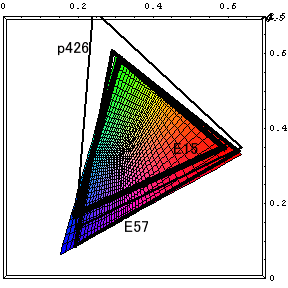 ここでは赤の座標値だけを眺めたが、Red,Green,Blueの各座標の値を眺めてみれば、そのディスプレイがどんな色空間を表示可能なのかが目安としてわかるだろう。Red,Green,Blueの組み合わせで色を表示するわけであるから、当然その三つの座標で囲まれる三角錐の範囲の領域が表示可能なわけである(大雑把に言えば)。ということは、このICMファイル、カラープロファイルを見れば、それぞれのディスプレイの大雑把な性能が判るわけだ。とても、大雑把にだけど。